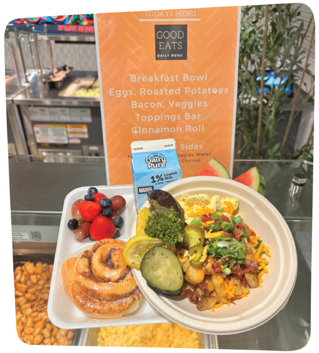 The challenge of creating meals that are both appealing and healthful is one April tackles with creativity and strategic partnerships. For K-12 students, she focuses on “kid-friendly favorites” while finding innovative ways to incorporate healthy sides. They use fresh local ingredients to create bright and flavorful side options to enhance the nutrition profile of the meal and to encourage students to try new foods.